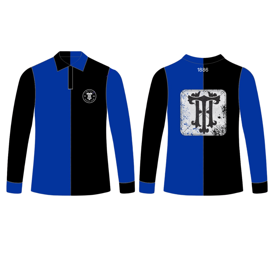 Crafted from fully sublimated Polycotton, this Heritage style shirt is steeped in the history of THC. With a modern twist, this rugby style shirt features the original 'split half colours' of Timperley Men's blue and black historic playing shirts. A woven heritage badge proudly sits on the chest, with a distressed printed and sewn on THC original logo on the back. A regular rugby shirt fit, perfect for off pitch wear and relaxing after the game.